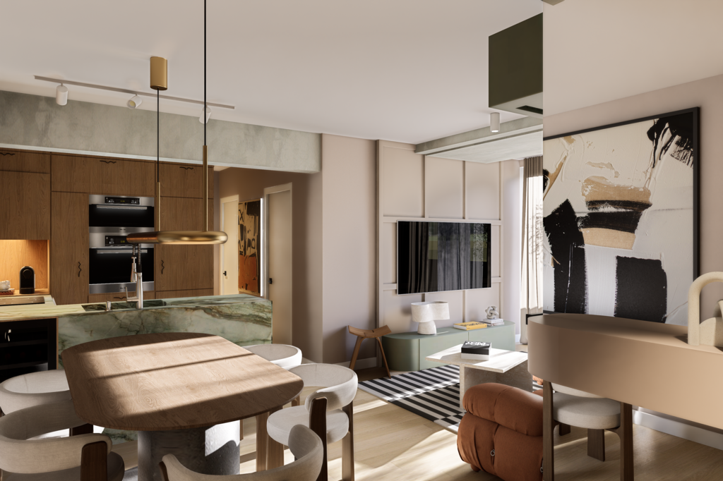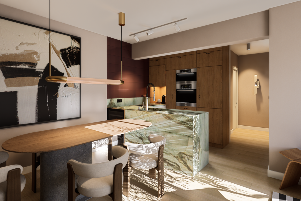 Kuhinja je, doslovno, srce stana. Elegantna i topla, s kombinacijom drva i raskošnog kamena u zelenim tonovima, djeluje kao arhitektonski statement, ali i kao prostor u kojem se stvarno živi i provodi vrijeme u druženju i kuhanju. Baršunasti tonovi zida u pozadini daju dubinu, dok decentna rasvjeta i zlatni detalji unose notu luksuza. Stol u prirodnom drvetu i dizajnerske stolice stvaraju dojam neformalnog, ali promišljenog druženja.