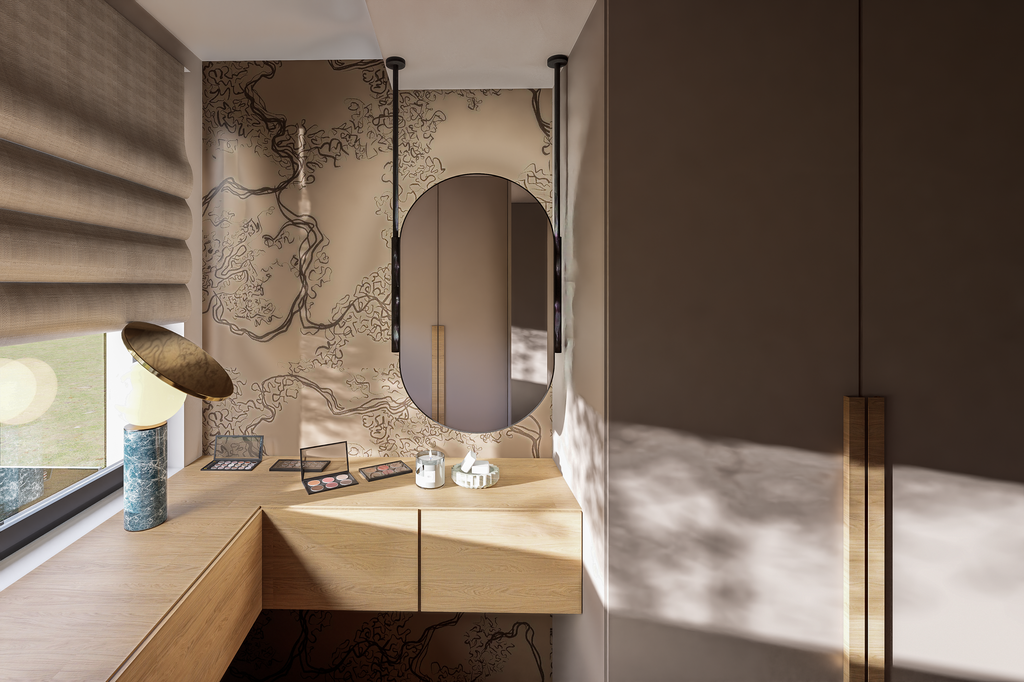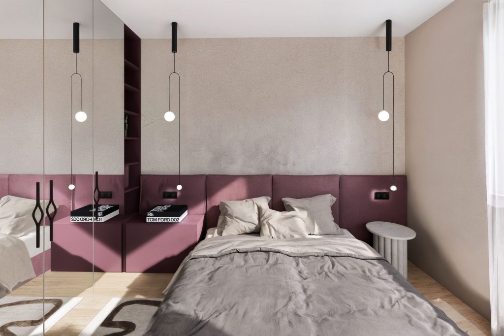U privatnom dijelu doma atmosfera se mijenja – ovdje prevladava intimniji, umjetnički ton. Tamno ljubičasta boja naglašava krevet i uzglavlje, a visilice iznad noćnih ormarića postaju statement detalj koji unosi skulpturalnost. Ogledala nježno reflektiraju svjetlo i dodaju dašak mistike, dok cijeli prostor ostaje smirujuć i profinjen.