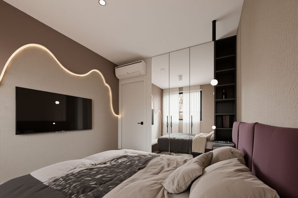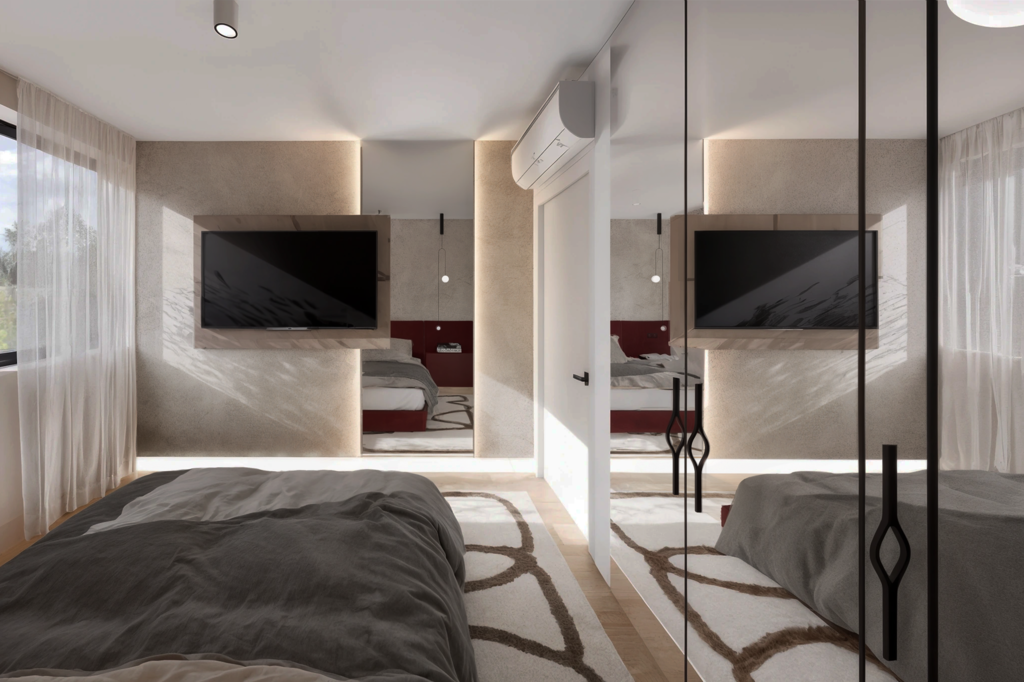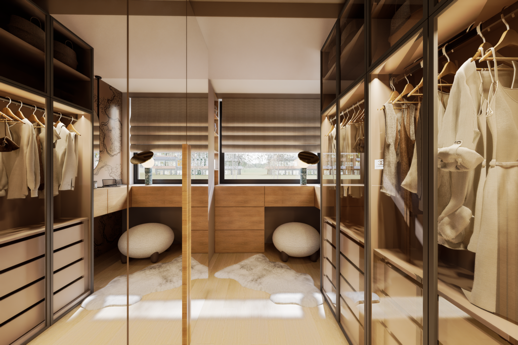 Poseban naglasak stavljen je na garderobu, čist i minimalistički dojam, dok varijanta sa staklenim frontama i LED rasvjetom stvara luksuzan boutique-efekt.