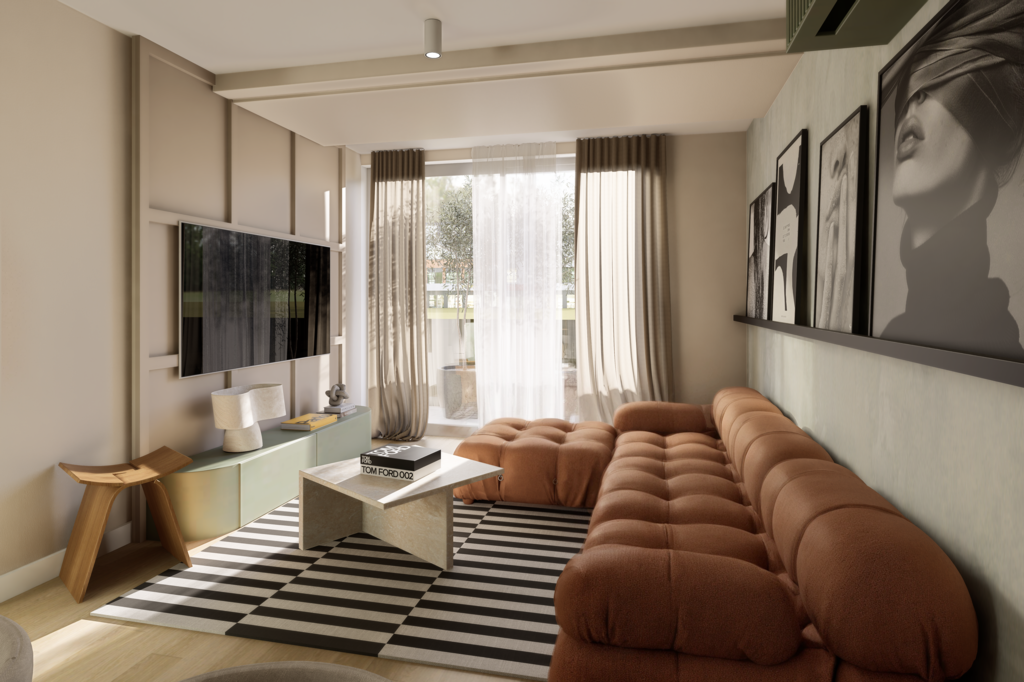 Već pri ulasku, pogled privlači dnevni boravak u kojem se ističe raskošna modularna sofa u nijansi konjaka. Njezin voluminozni oblik i mekani jastučići prizivaju bezbrižnost i hedonizam, dok crno-bijele fotografije na zidu dodaju dozu umjetničke ozbiljnosti. Cijeli prostor diše zahvaljujući pažljivo odmjerenim tonovima – između toplog drva, bež zidova i detalja u zelenom mramoru koji u kuhinji postaje glavni vizualni akcent.