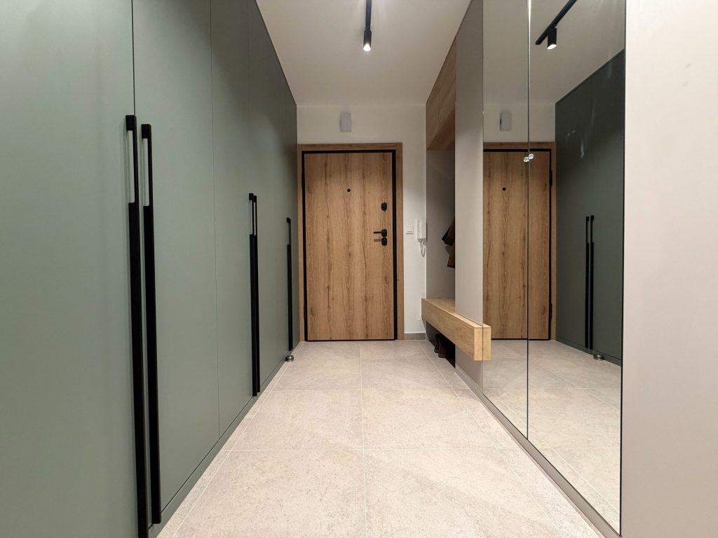 Najizazovnije je bilo osmisliti ulazni hodnik s ormarima. Kako bih izbjegla monotoniju klasičnih zatvorenih ormara, s desne strane odabrala sam zelene fronte s crnim elegantnim ručkama, a s lijeve sam „razbila“ dugačku plohu kombinacijom otvorenih i zatvorenih elemenata u bijelom medijapanu, drvenom dekoru i s detaljima ogledala koji prostoru daju osjećaj prozračnosti i suptilnog luksuza.