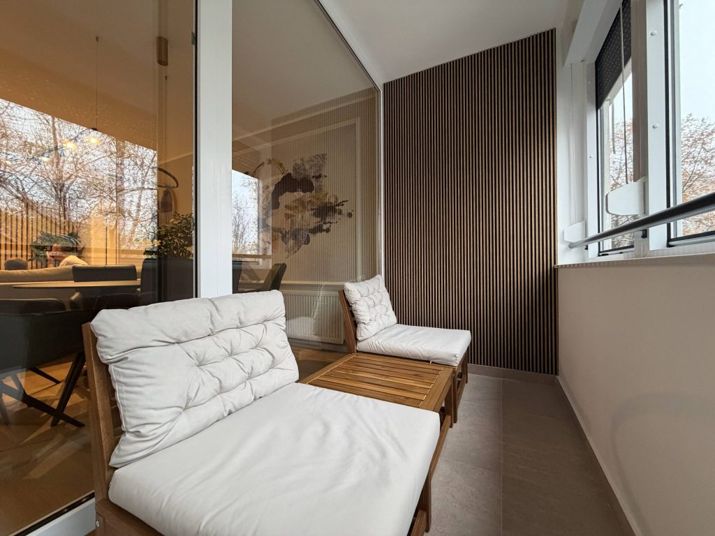 Lođa je uređena minimalistički, s oblogom u imitaciji drva i udobnim vanjskim foteljama. Dječje sobe uređene su živahno, uz kombinaciju modularnog namještaja, boja i tapeta. Svaka soba ima svoju funkcionalnu nišu.