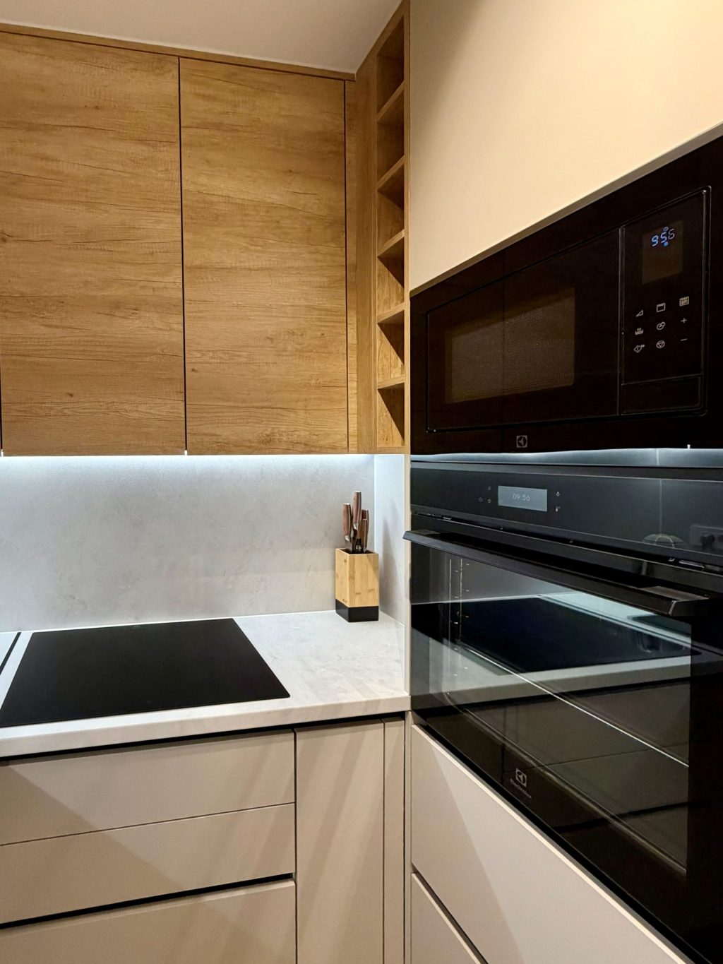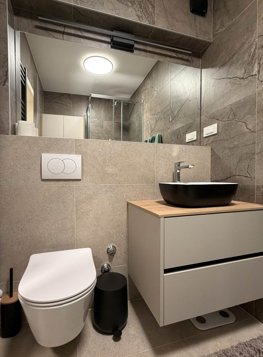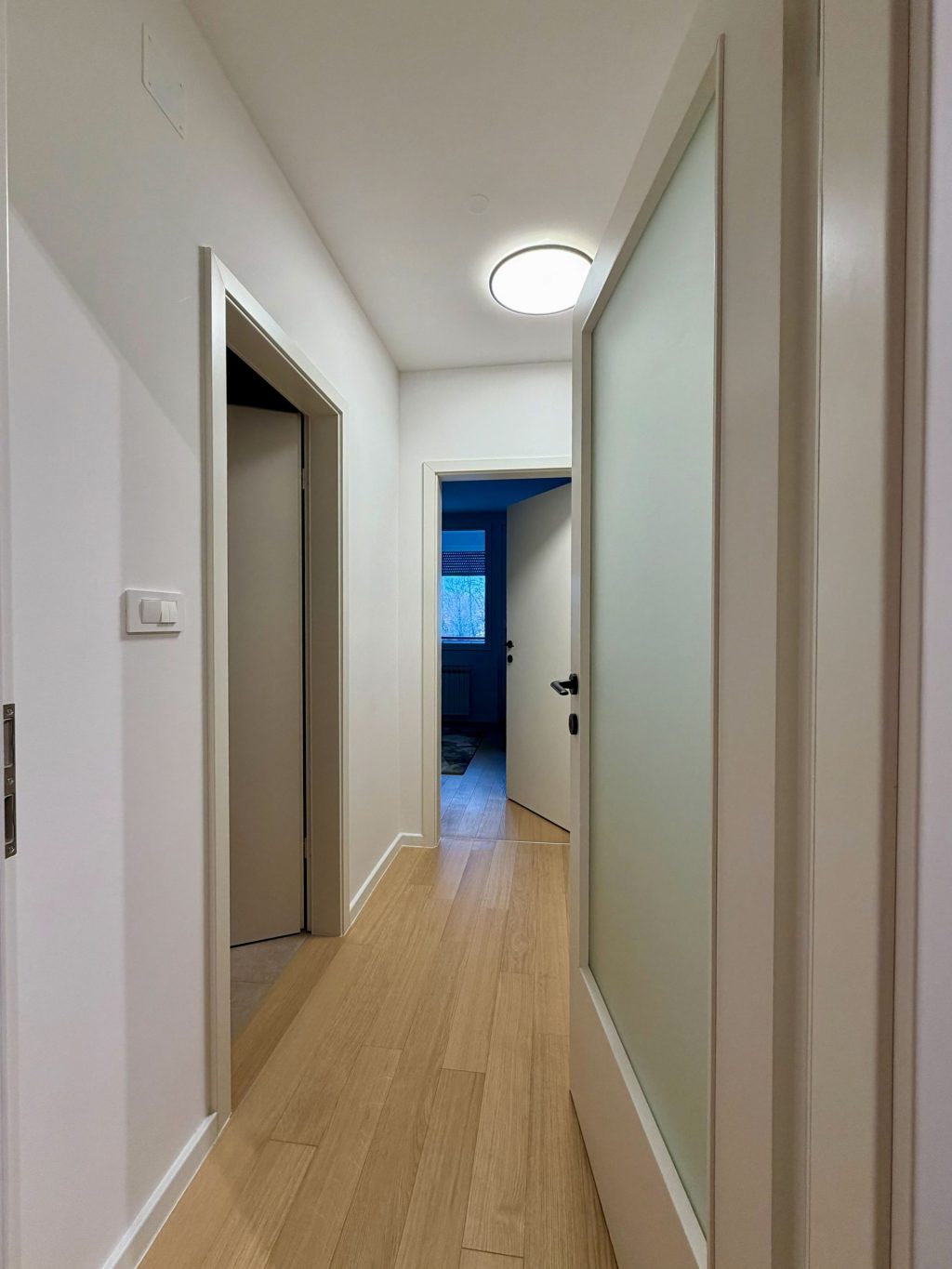 U malom zasebnom toaletu smjestili smo mini praonicu. Nova keramika i parket postavljeni su u cijelom stanu, a internet kablovi provedeni su u svaku sobu. Obratili smo pažnju na svaki detalj, uključujući i promjene u pozicioniranju rasvjete, što je zahtijevalo dodatne radove.