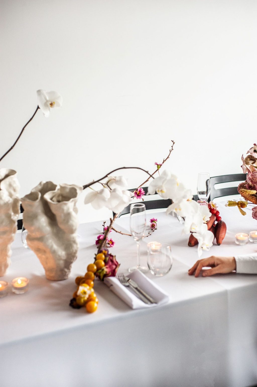 Meko, raspršeno svjetlo — kroz svijeće različitih visina ili difuznu stolnu lampu — stvara dramatične sjene i naglašava teksture. Stol zapravo „oživi“ tek kad se upali rasvjeta. U tom trenutku sve postaje dio iste skulpture: ljudi, predmeti, hrana, čak i praznine između njih.