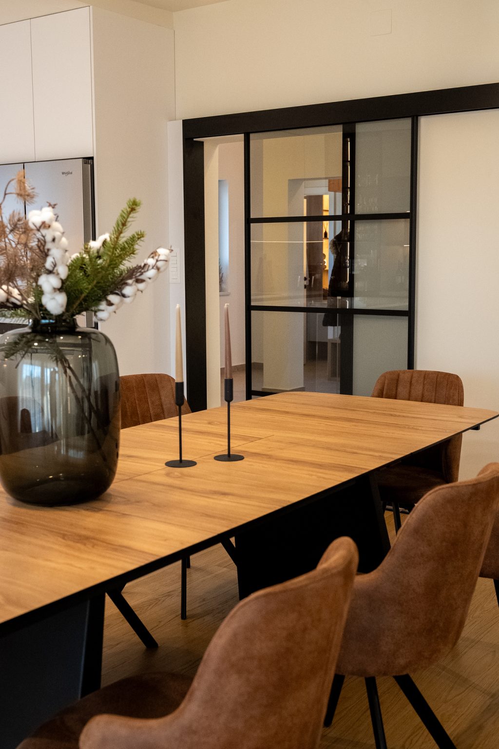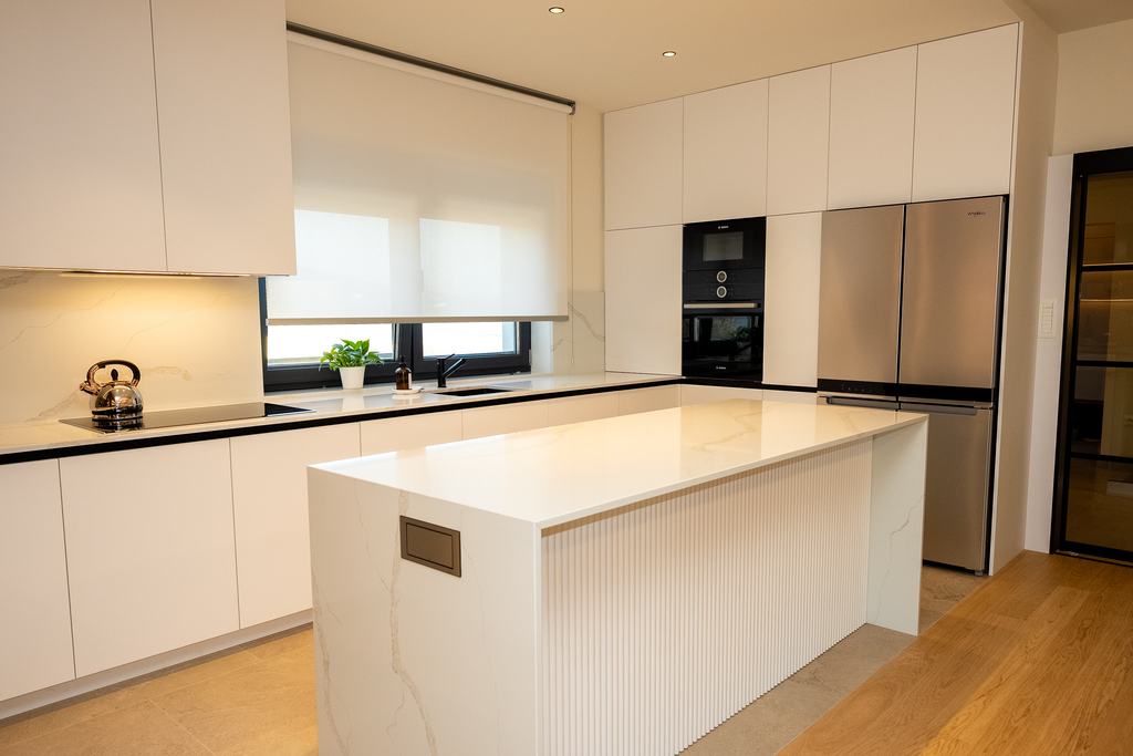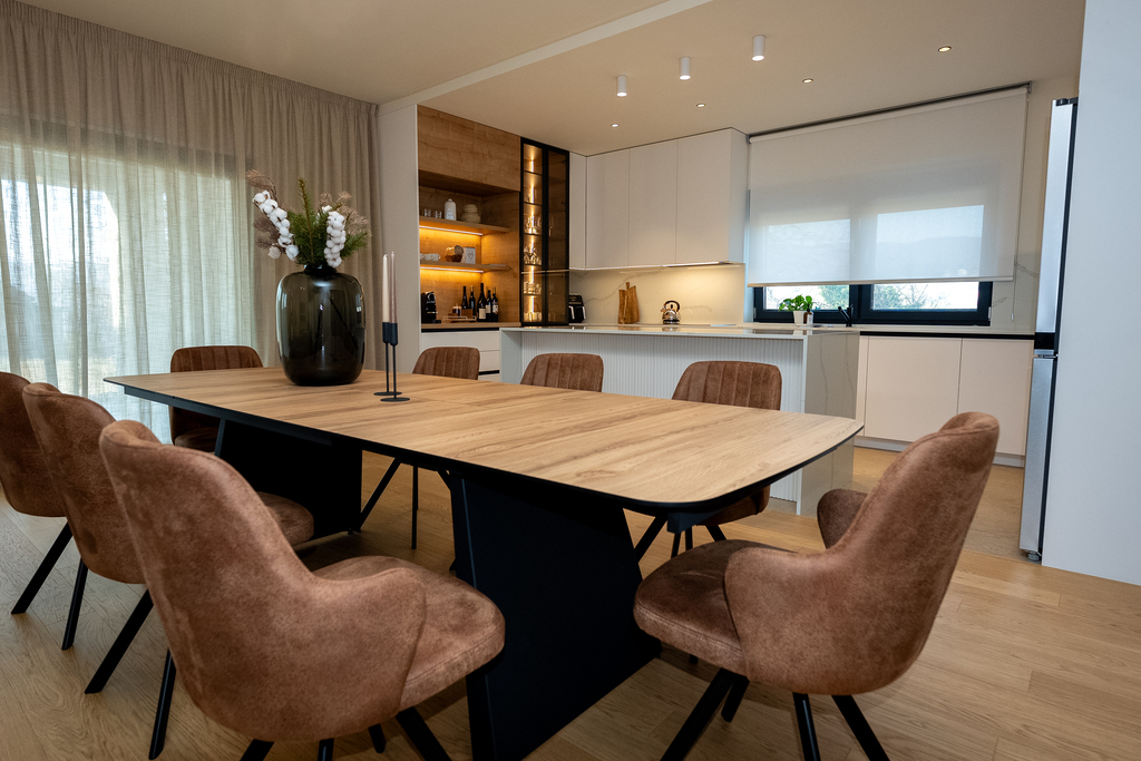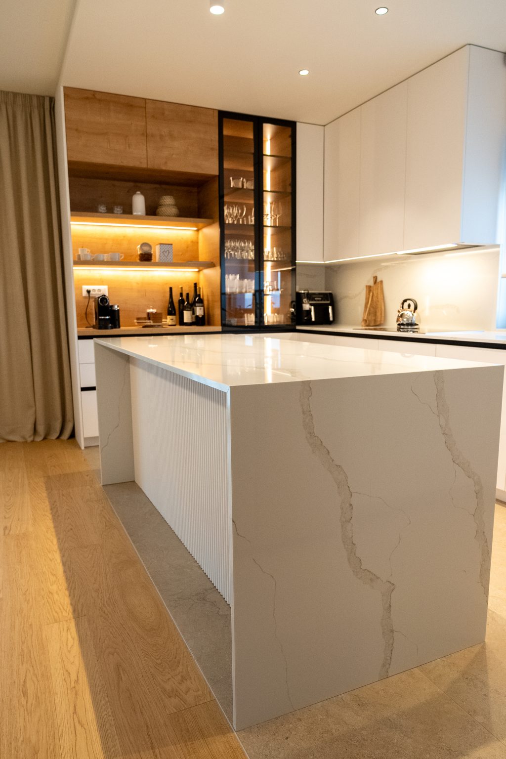 Kuhinja, kao središnje mjesto doma, osmišljena je kao prostran i minimalistički prostor ravnih linija, s velikim kuhinjskim otokom. Posebnu vrijednost daje joj kutak za kavu u drvnom dekoru, otvoren prema prostoru, uz koji se nalazi elegantna staklena vitrina. Radna ploča od kvarca dodatno doprinosi dojmu elegancije i suptilnog luksuza.