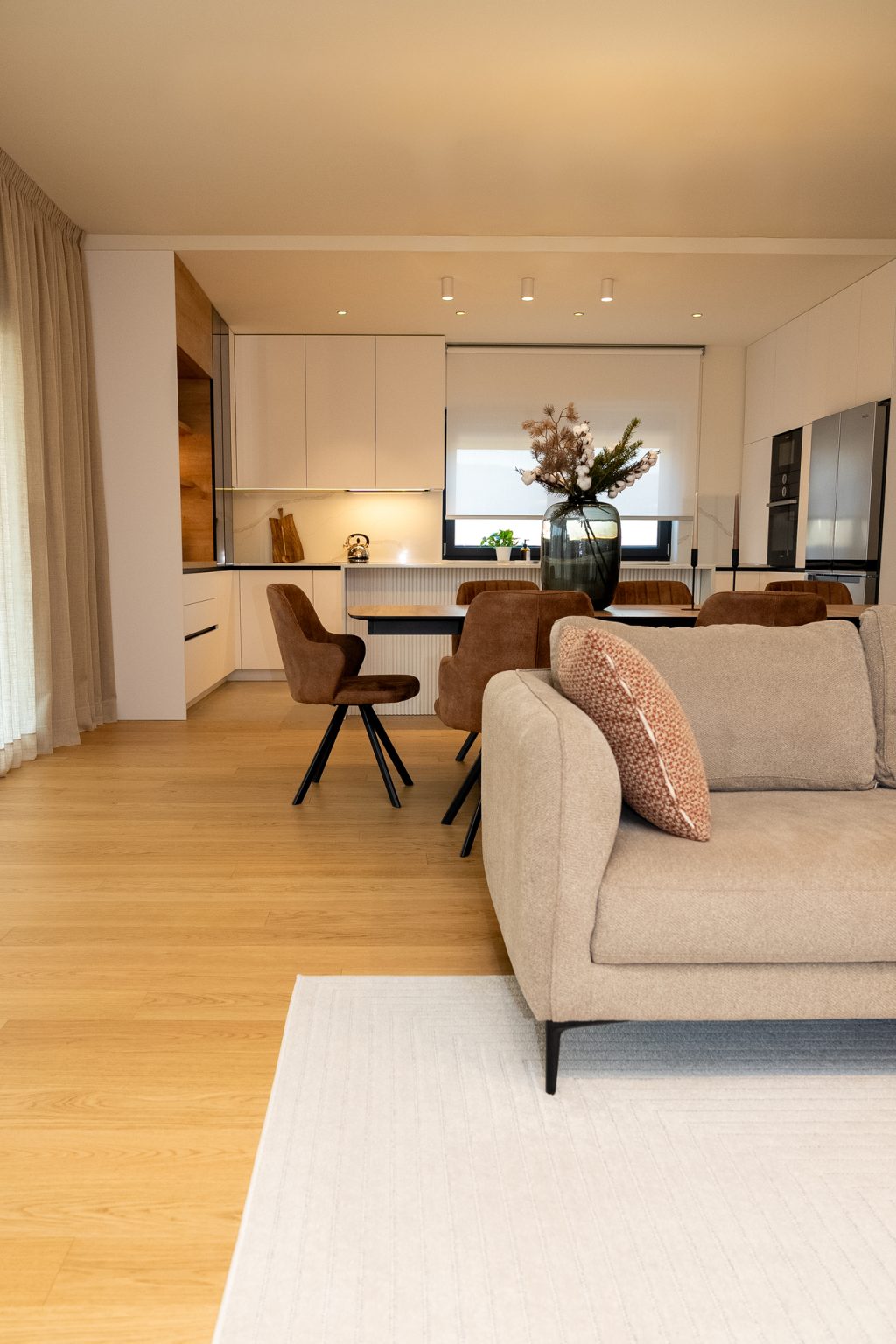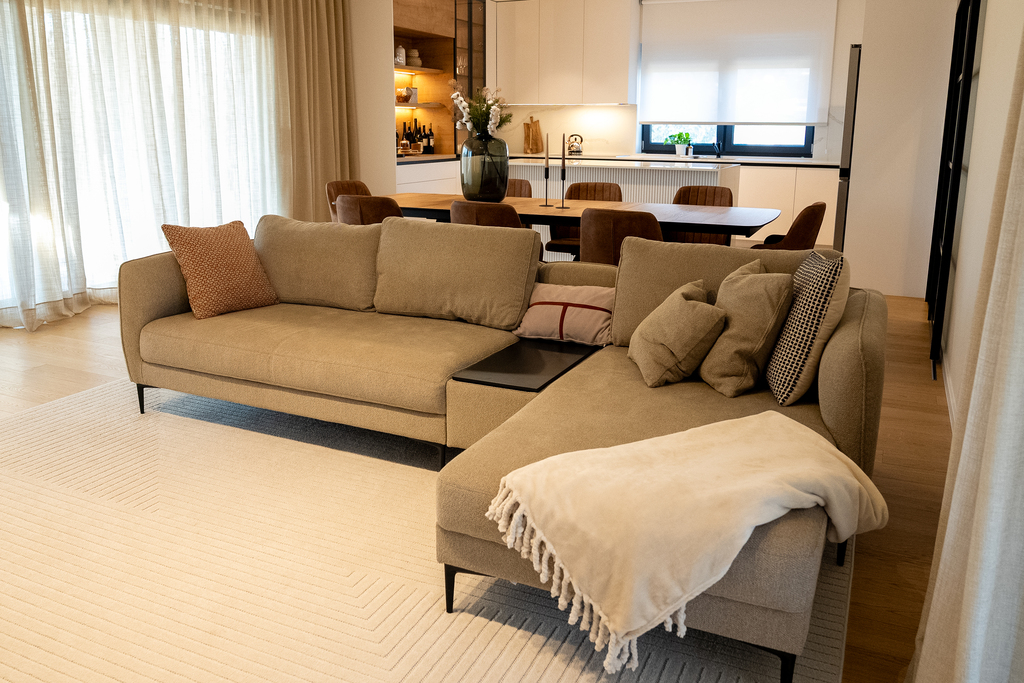 Cijeli prostor planiran je detaljno kako bi bio maksimalno funkcionalan, ali i estetski usklađen. Investitori su preferirali tople, svijetle i neutralne tonove, što je postignuto kombinacijom tople nijanse hrasta i podnih pločica koje se skladno nadovezuju jedna na drugu. Svemu pridonose i pažljivo birane boje i teksture tkanina namještaja i zavjesa.