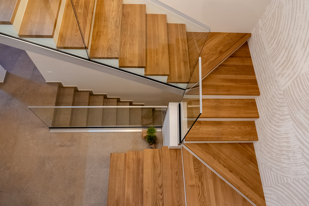 Otvoreno stepenište vodi na galeriju na kojoj su smještene spavaće sobe, kupaonica i praonica. Iako se radi o velikom prostoru, interijer djeluje iznimno toplo i ugodno, što je postignuto pažljivim odabirom materijala, boja i posebno rasvjete koja zaokružuje cjelokupan doživljaj doma.