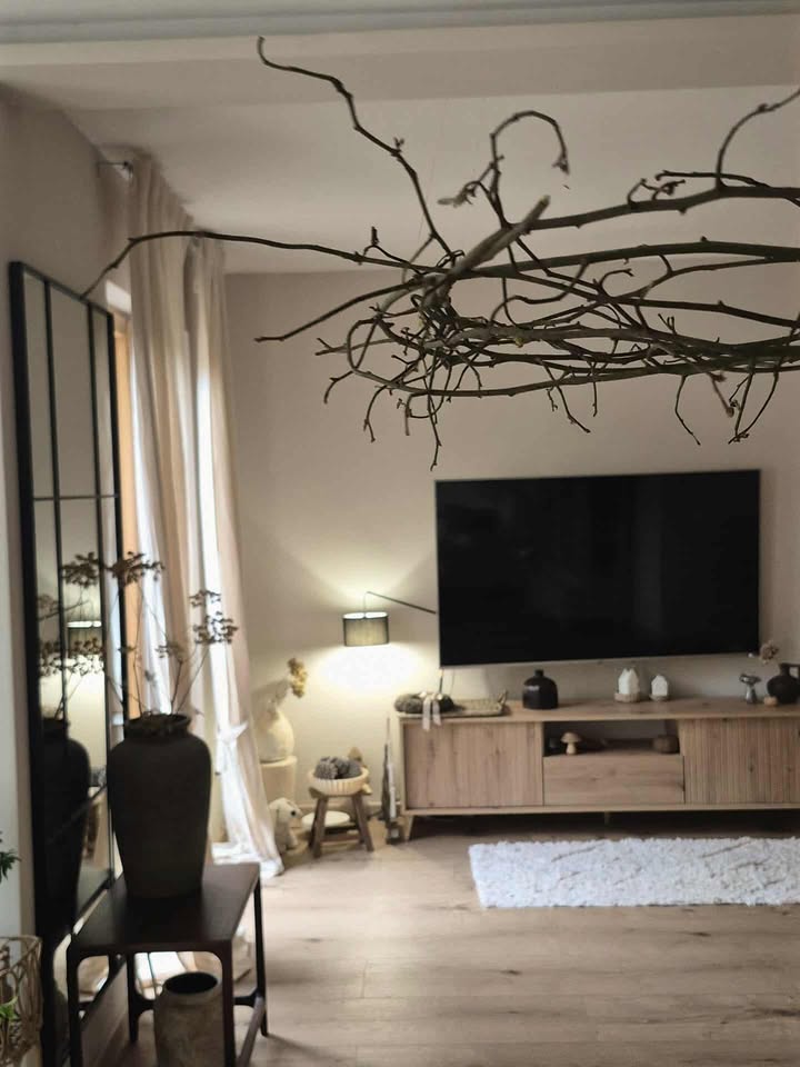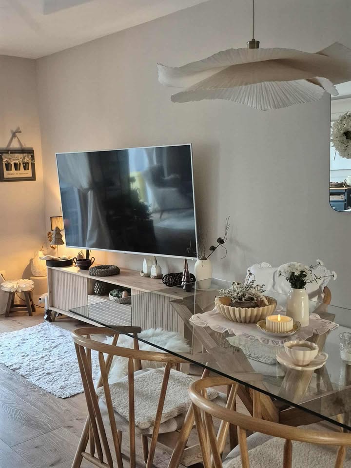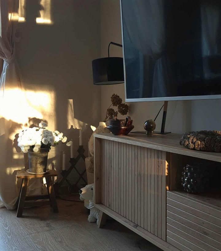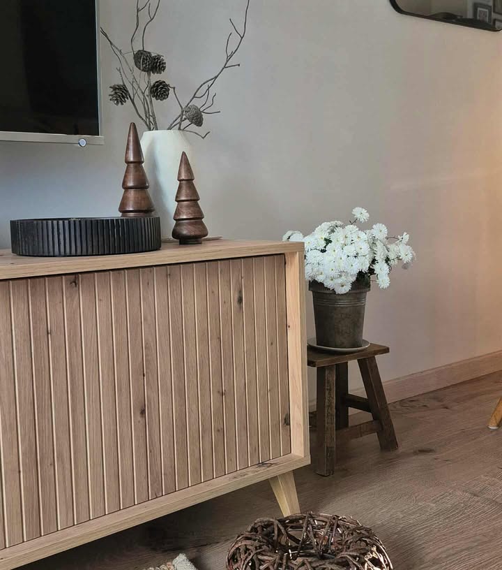 U središtu dnevnog boravka ističe se drveni TV ormarić s rebrastim frontama, koji svojom toplom teksturom daje ritam cijelom prostoru. On nosi i glavnu estetiku stana: puno prirodnog drva, mekane neutralne nijanse i jednostavne linije, uz dodatak rustikalnih i ručno rađenih dekoracija. U trenucima popodnevnog svjetla, koje se ovdje prelijeva poput toplog filtra, prostor poprima gotovo poetsku atmosferu.