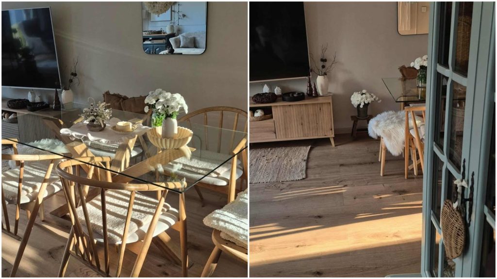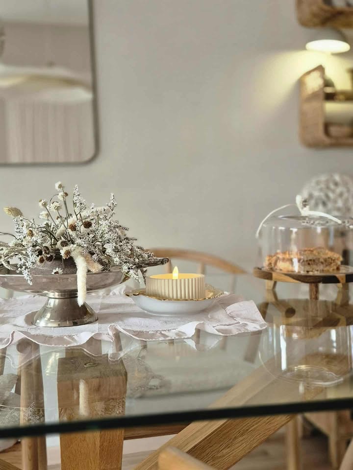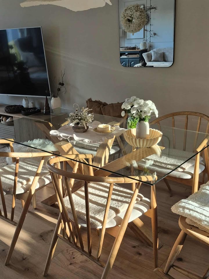 Blagovaonica s velikim staklenim stolom i drvenim stolicama presvučenima mekanim jastučićima nastavlja istu priču — prozračnost, svjetlost i toplina. Na stolu se izmjenjuju sezonske dekoracije: od nježno aranžiranih suhih cvjetova do elegantnih keramičkih zdjelica i tanjura. Sve izgleda kao mala stilizirana scena, ali bez osjećaja da je “previše”; više kao svakodnevni ritual koji prostoru daje dušu.