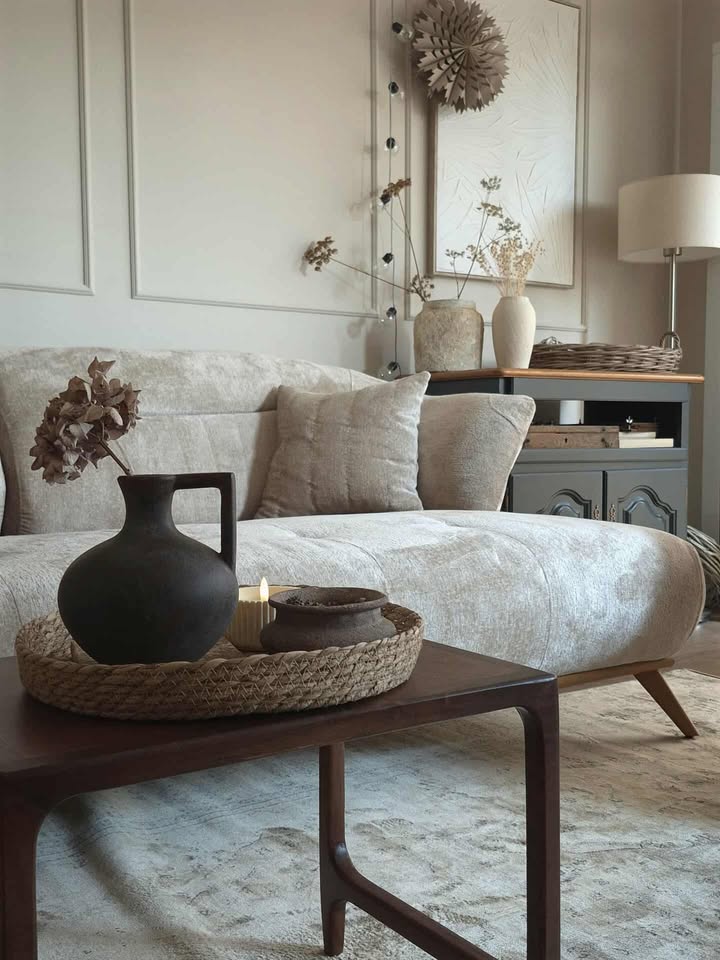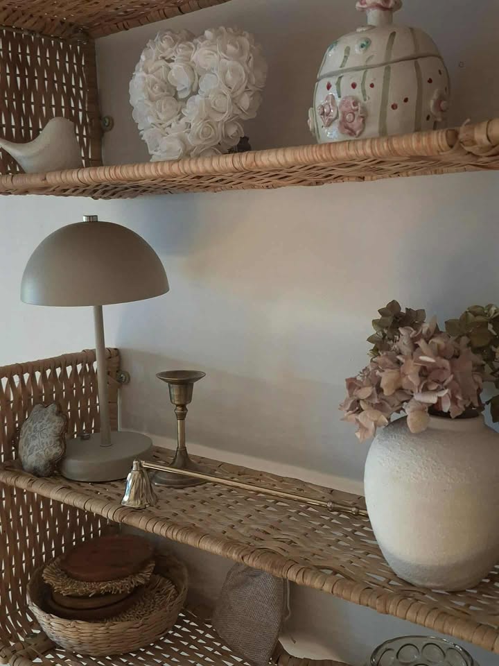 Svuda se provlače detalji koji čine razliku — buketi suhih grana u keramičkim vazama, drvene skulpture, pletene košare, te sitni dekor poput staklenih i metalnih zdjelica koje daju dašak starinskog šarma. Posebnu čar donose bijeli cvjetovi u metalnim posudama i jednostavni svijećnjaci koji stvaraju dojam doma uvijek spremnog za ugodan predah.