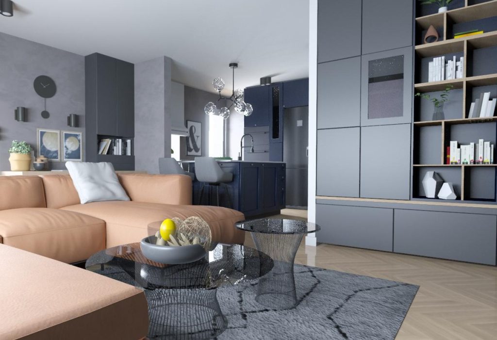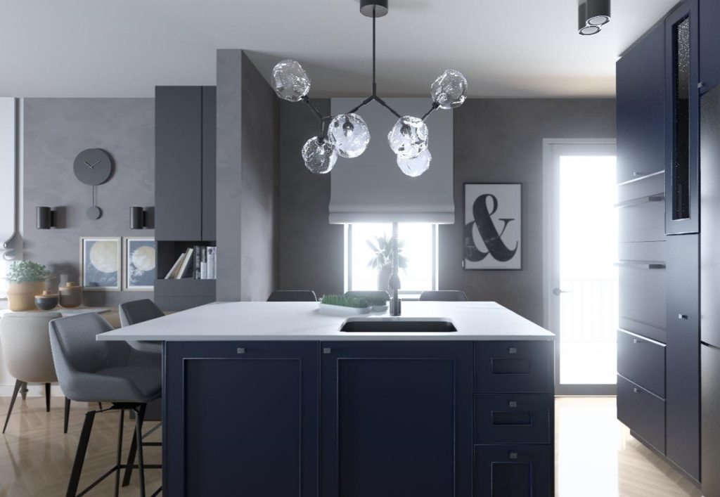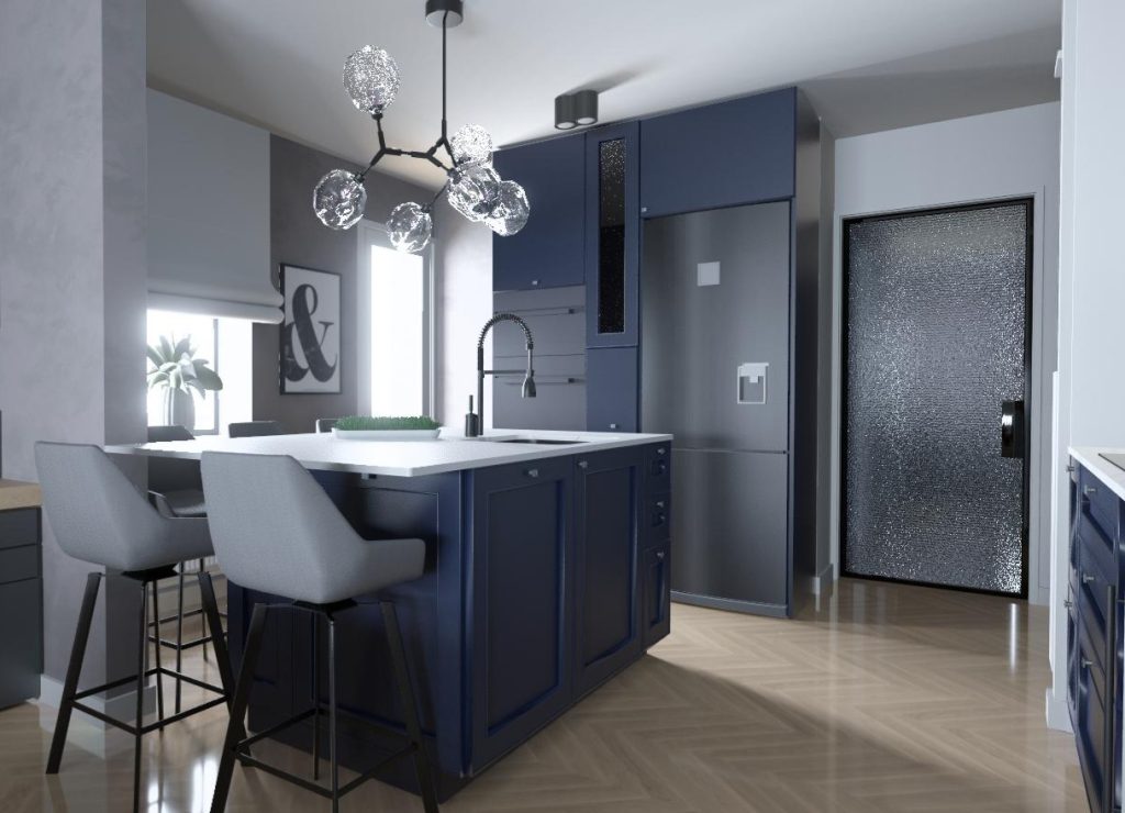 Premda plava boja unosi muški karakter, detalji poput staklenog lustera unose dozu luksuza i vizualne lakoće. Rezultat je prostor koji je istovremeno snažan, praktičan i sofisticiran.
