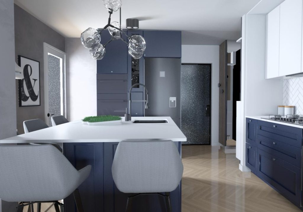 Kuhinja je oblikovana u tri jasno segmentirana dijela: prostor za kuhanje, otok s elementima za pranje te zonu za skladištenje s hladnjakom i pećnicama. Plava i bijela boja, koje dominiraju prostorom, dobile su elegantnu notu zahvaljujući profinjenim ukladama na frontama i radnoj plohi u uzorku mramora.