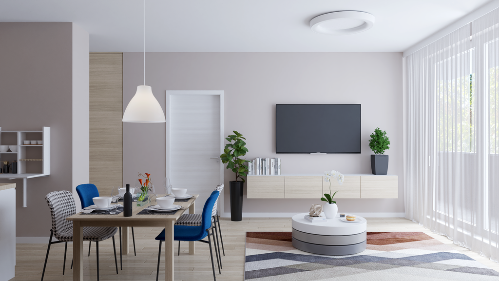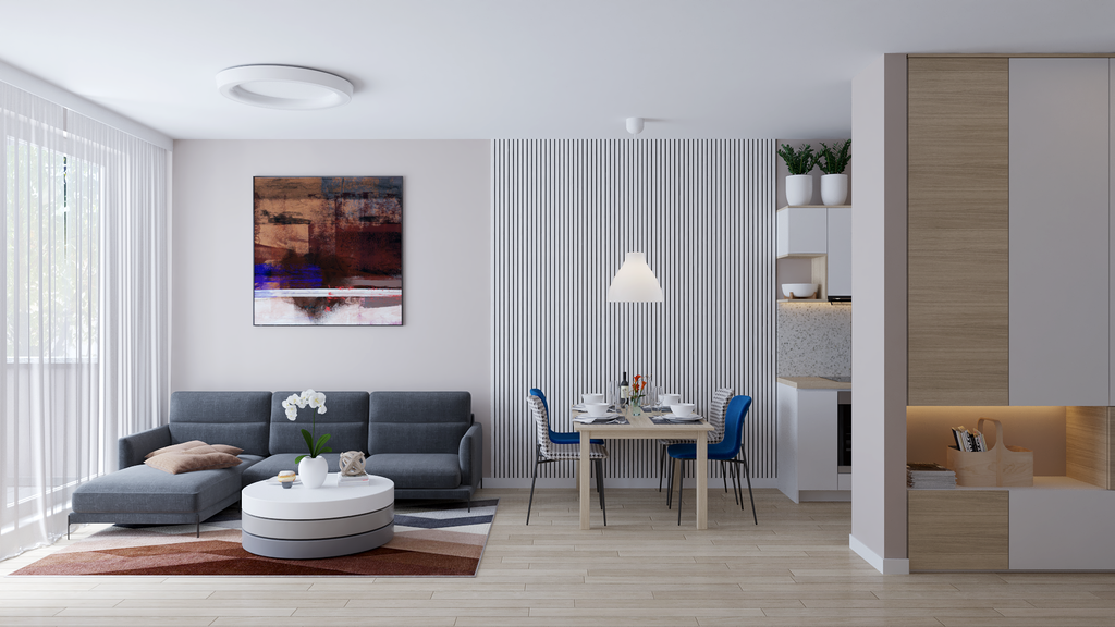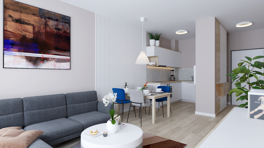 U dnevnom boravku i blagovaonici želja je bila blago odvojiti funkcionalne zone. Rješenje je pronađeno u dekorativnom panelu od letvica koji daje toplinu i strukturu prostoru. Neutralnu paletu tonova razigravaju plavi akcenti – dvije stolice u blagovaonici i apstraktna slika iznad sofe. Okrugli stolić pred garniturom prati formu rasvjetnih tijela, dok jednostavna TV-komoda s četiri ladice zaokružuje skladan i nenametljiv dnevni prostor.
