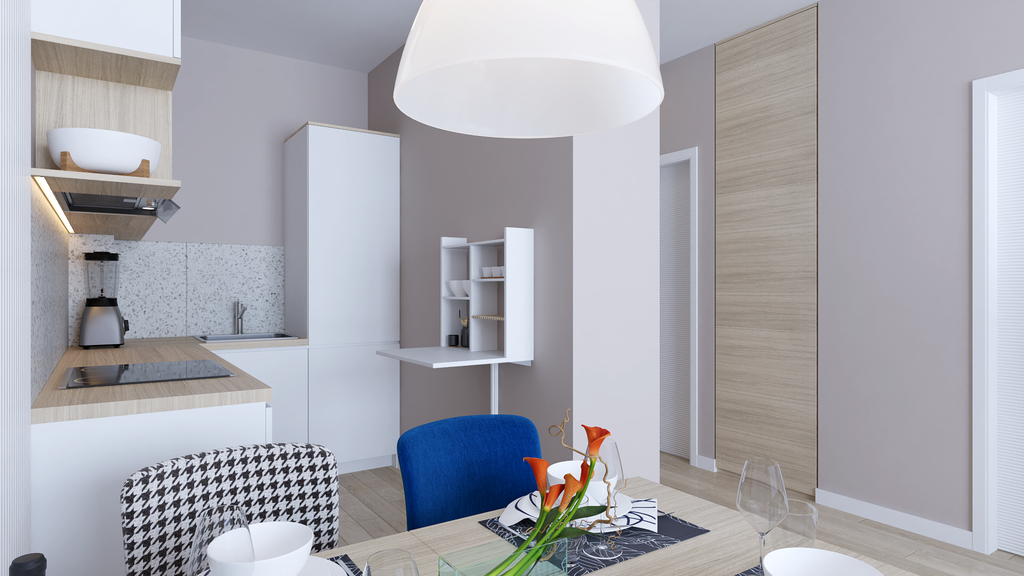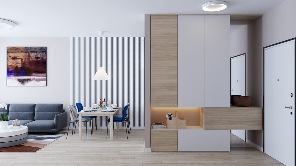 Tako je, primjerice, ulazni hodnik diskretno proširen na račun dnevnog boravka kako bi se dobilo dovoljno prostora za garderobu, dok je s druge strane zida produljena kuhinja. Tom je izmjenom, iako se smanjio dio dnevnog boravka, postignuta bolja funkcionalnost cijelog prostora.