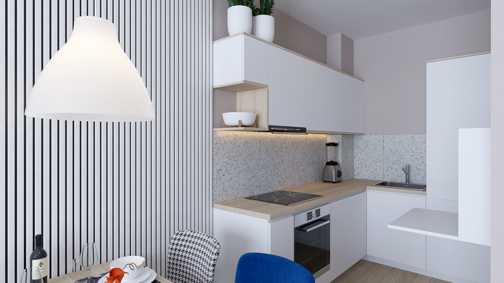 Kuhinja je kompaktna, ali maksimalno funkcionalna – s ugradbenim hladnjakom, perilicom posuđa, kuhalom, pećnicom i dodatnim rasklopnim stolićem iz IKEA asortimana koji služi kao pomoćna radna površina.