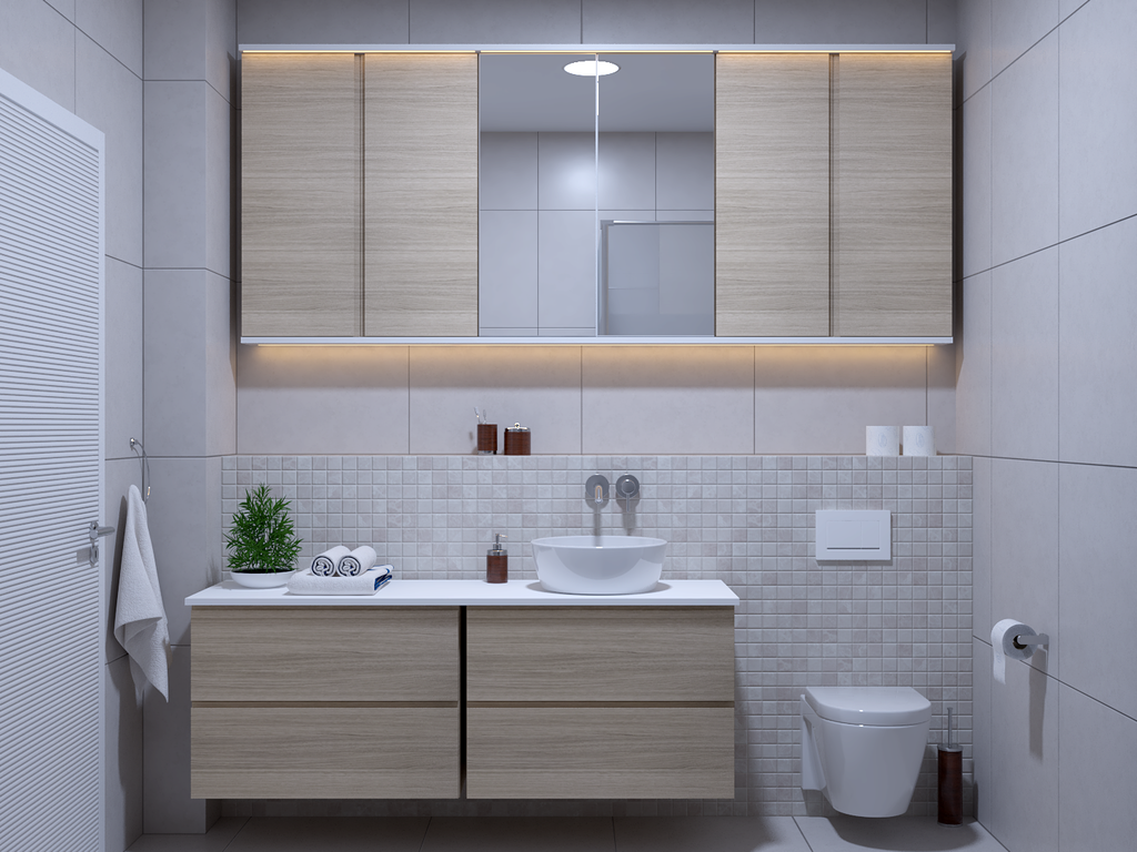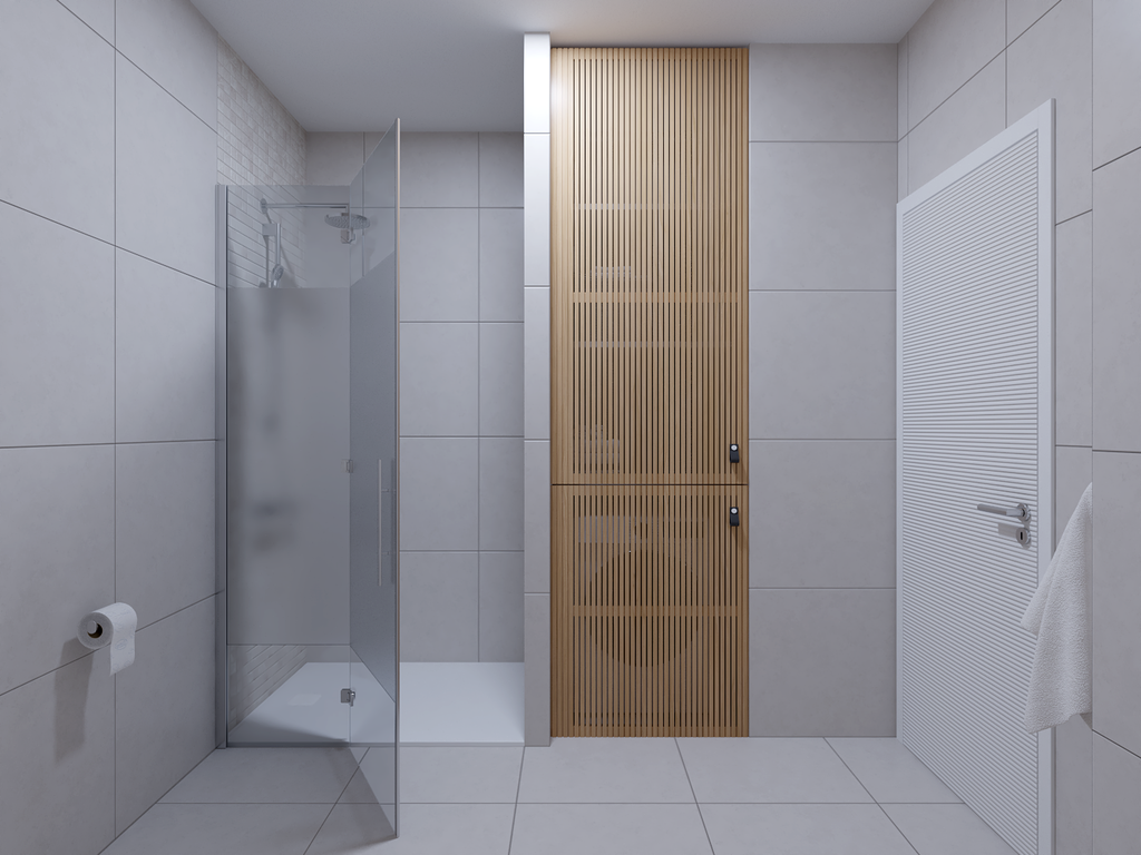 Kupaonica od 6,5 m² zadržala je svoju prostranost i ravnotežu elemenata. Osim tuš kabine i WC-a, sadrži i umivaonik smješten na ormariću s četiri prostrane ladice, zidni ormarić s ogledalom i ambijentalnom rasvjetom. Nasuprot se nalazi tuš kabina dimenzija 120×90 cm te niša za perilicu rublja.