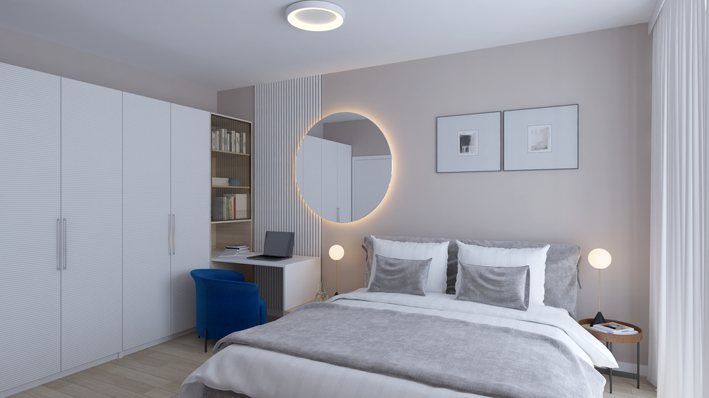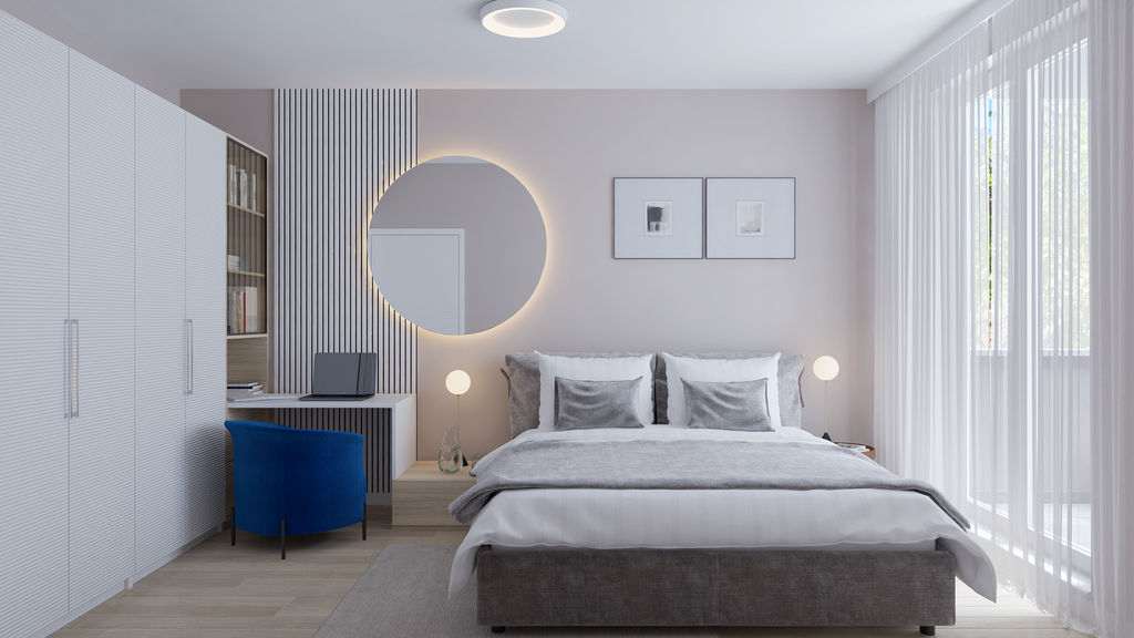 Spavaća soba, osim udobnog kreveta i ormara po mjeri, krije i mali, ali pažljivo osmišljen radni kutak. Umjesto klasičnog stola, izrađen je elegantan nastavak garderobnog ormara koji se pretvara u toaletni stolić s velikim okruglim ogledalom i ambijentalnim svjetlom. Zid iza njega ukrašen je panelom od bijelih letvica, a dvije slike iznad kreveta unose simetriju i sklad. Plava fotelja povezuje ovu prostoriju s dnevnim dijelom i unosi dozu svježine.