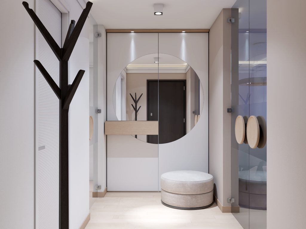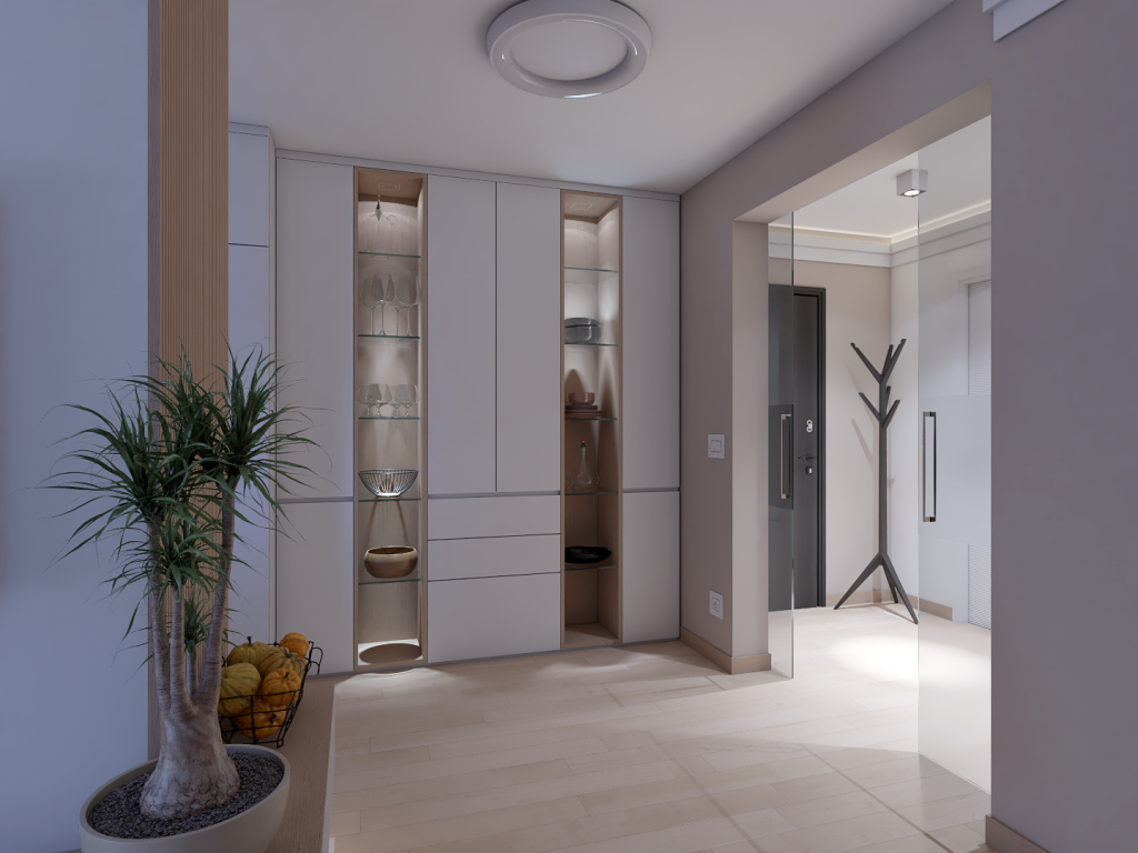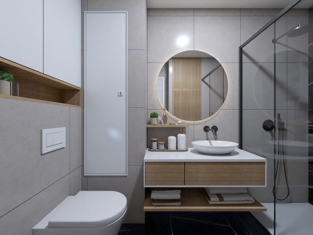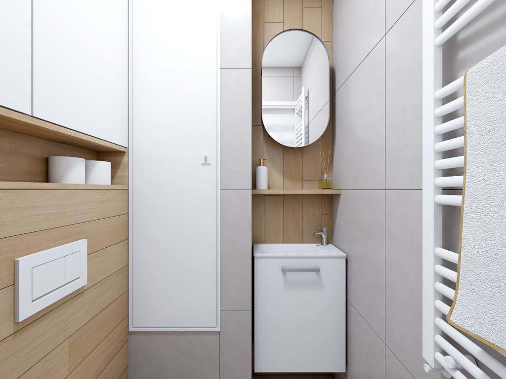 U kupaonici je nedostajalo mjesta za perilicu i sušilicu, što nije neobično u stanovima ove kvadrature. Uz malo logike, prstohvat mašte i dosadašnjeg iskustva, rješenje je ispalo genijalno jednostavno. Probili smo dio zida prema ulaznom hodniku i u hodniku napravili dublji ugradbeni ormar u koji s leđa “ulazi” i perilica i sušilica. Funkcionalno, elegantno i potpuno neprimjetno. To su ona mala rješenja koja život čine lakšim, a stan pametnijim.