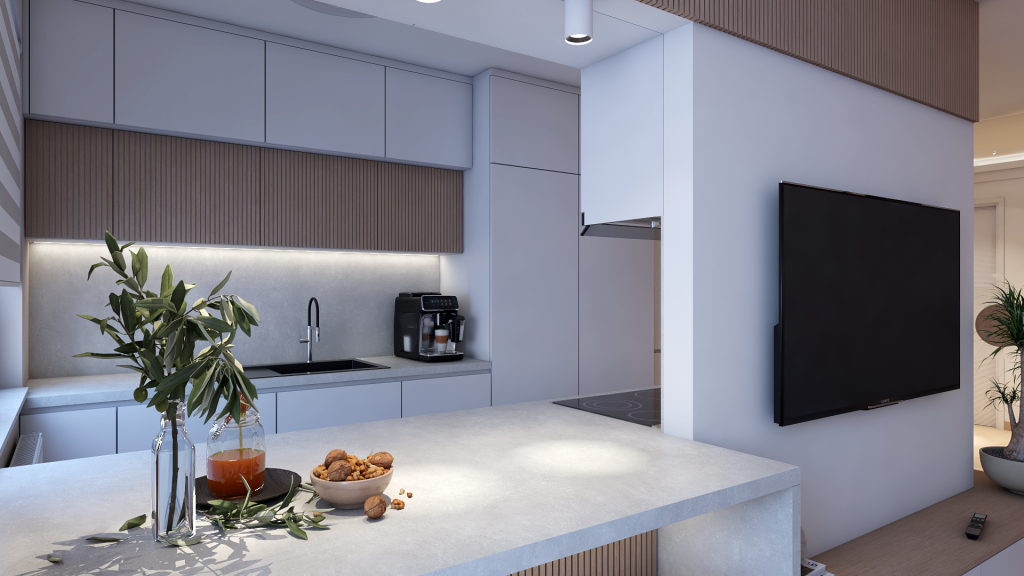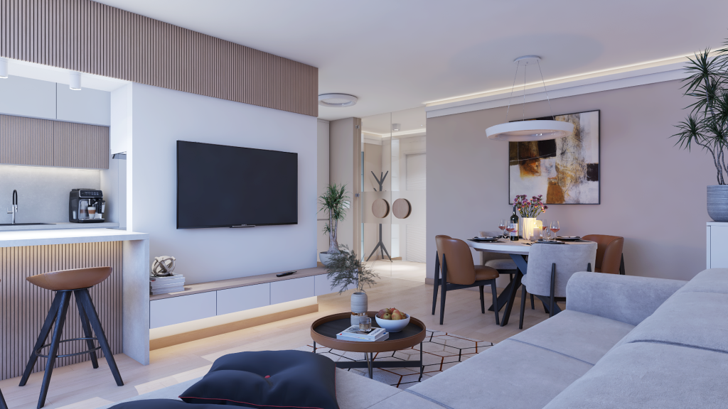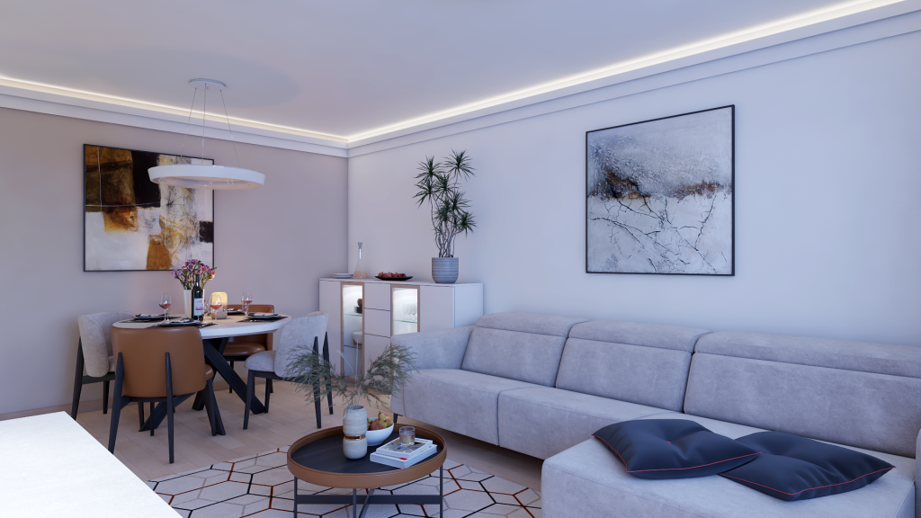 Kad smo definirali tlocrt, slijedio je najdraži dio, izrada 3D modela stana s kompletnim namještajem, rasvjetom i dekoracijama. To je trenutak kad klijenti prvi put vide svoj budući dom i počnu s onim poznatim “Jao, kako je lijepo!”. To je trenutak koji vrijedi svakog truda.