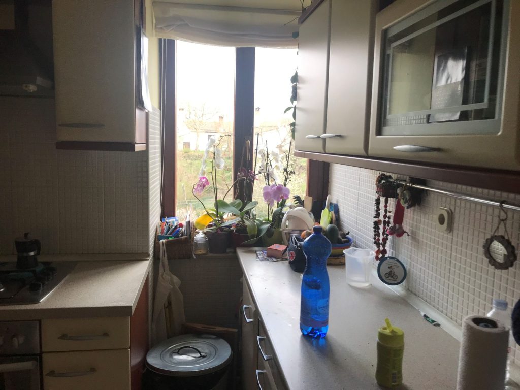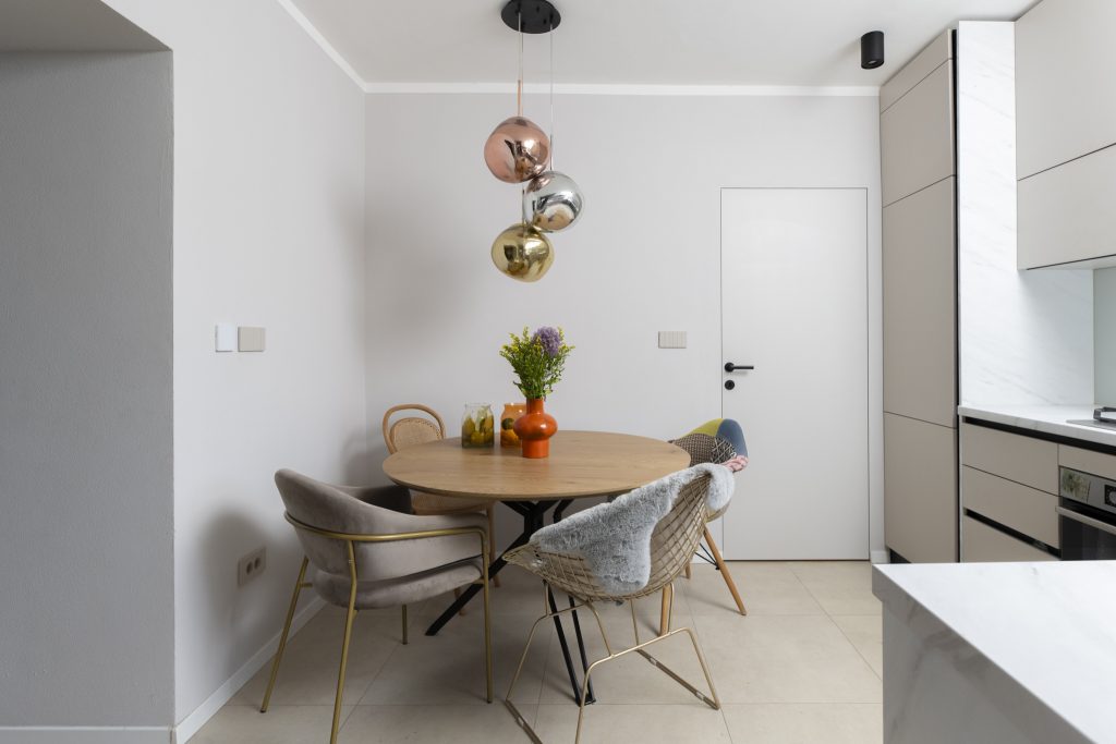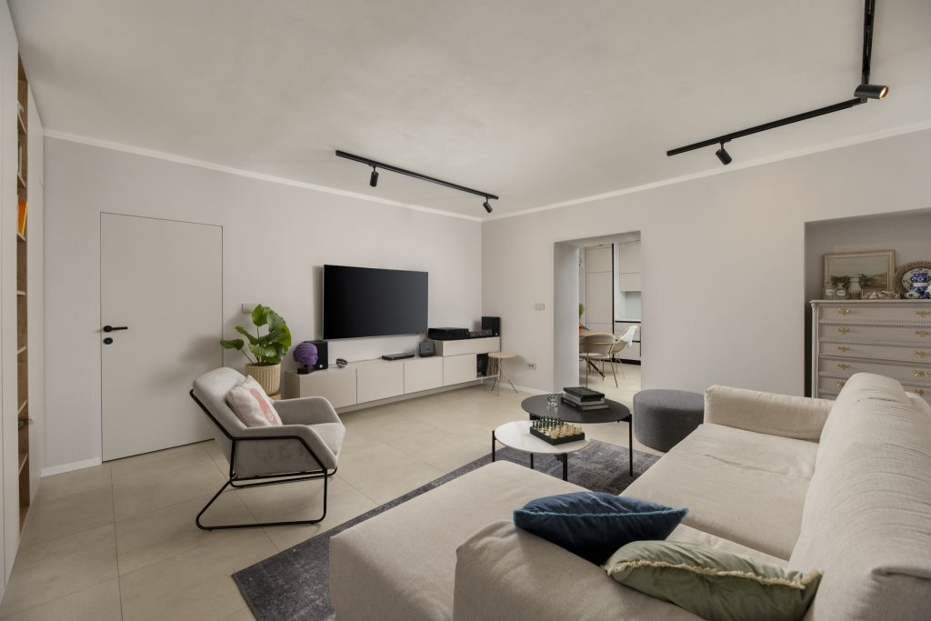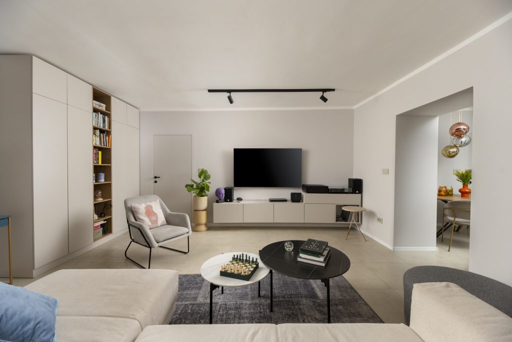 Uklanjanjem pregradnih zidova između nekadašnje male kuhinje i dječje sobe formiran je jedinstveni dnevni prostor koji danas objedinjuje kuhinju, blagovaonicu i dnevni boravak. Ova nova prostorna cjelina postala je središte stana – mjesto okupljanja, boravka i svakodnevnih aktivnosti, prilagođeno dinamici obiteljskog života.