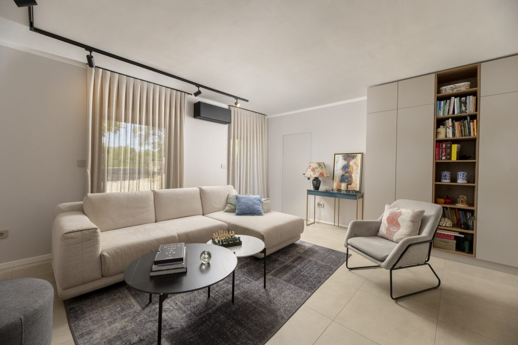 Blagovaonica je zamišljena kao prijelazna zona između kuhinjskog i dnevnog dijela, potičući povezanost i neometan protok kretanja, dok dnevni boravak funkcionira kao smirena zona za opuštanje. Neutralna koloristička osnova, meke teksture i pažljivo planirana rasvjeta omogućuju prostoru da se prilagođava različitim scenarijima korištenja – od dnevnog boravka do večernjeg odmora. Velike staklene površine dodatno naglašavaju osjećaj prozračnosti i povezanosti s eksterijerom.
