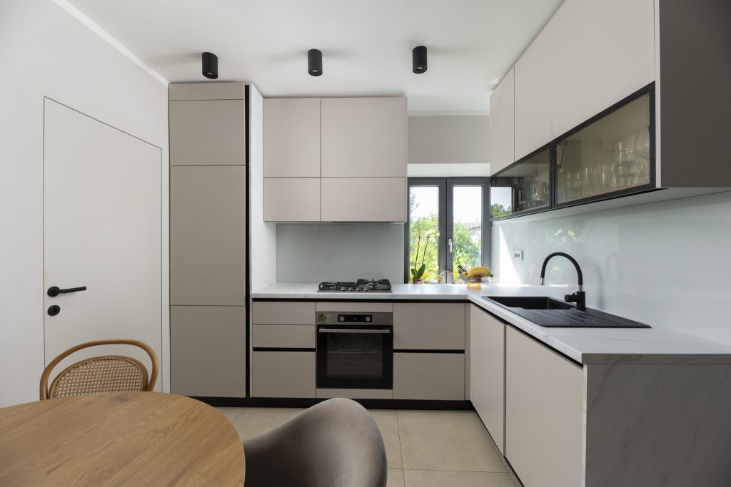 Kuhinja je oblikovana kao funkcionalno i vizualno suzdržano središte otvorenog prostora. Frontama u nijansi kašmira, čistim linijama i integriranim elementima postiže se dojam mirne cjeline koja se prirodno nastavlja na blagovaonicu i dnevni boravak. Odabir materijala usmjeren je na trajnost i jednostavno održavanje, čime kuhinja postaje prostor svakodnevnog korištenja, ali i diskretan arhitektonski element interijera.