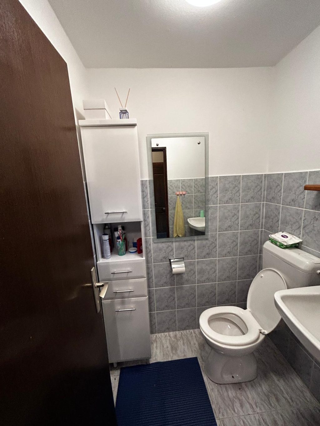 Kombinacija svijetlih i neutralnih tonova čini ovu zonu prozračnom i svijetlom, dok mozaik pločice u kupaonici uvode dozu razigranosti i teksture. Dva umivaonika daju dodatnu praktičnost – idealno za boravak više osoba.