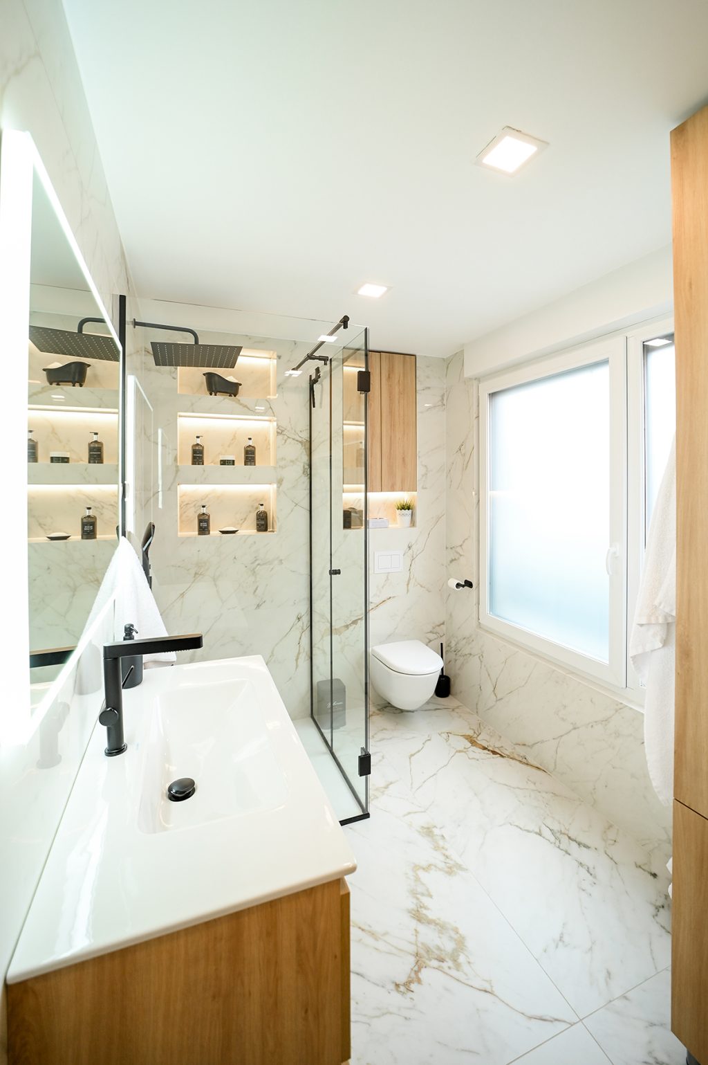 Prostor je zamišljen kao minimalistički, ali s puno pažnje posvećene detaljima, a ključni element u njegovoj transformaciji bila je LED rasvjeta, koja je postala zaštitni znak Silvijinih projekata. Ova vrsta rasvjete ne samo da prostoru daje potrebnu svjetlost, već ga čini vizualno većim i luksuznijim. LED rasvjeta, smještena na strateškim mjestima, stvorila je ugodnu atmosferu koja istovremeno naglašava arhitektonske linije i daje dojam prozračnosti.