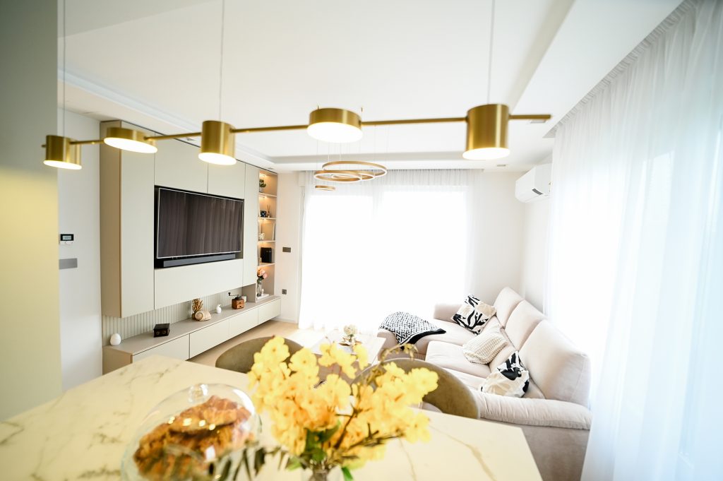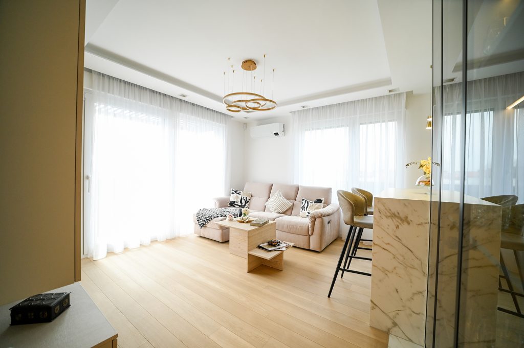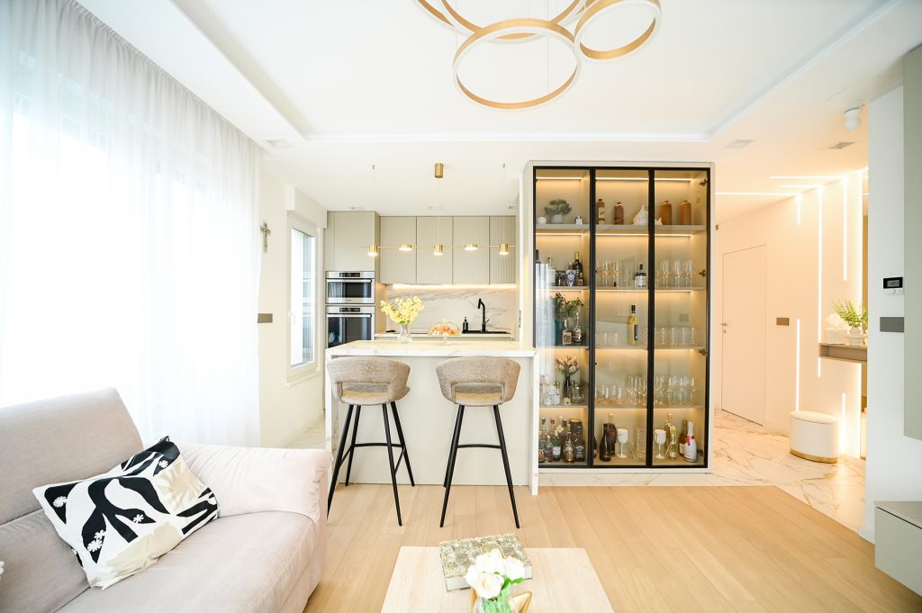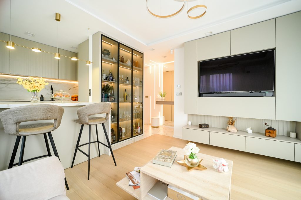 Stan je sjajan primjer kako i mali prostor može biti izuzetno funkcionalan i lijepo uređen, a to sve zahvaljujući stručnosti dizajnerice Silvije Tičić Ivande. Kroz promišljenu kombinaciju materijala, boja i rasvjete, ona je stvorila prostor u kojem se osjećaju luksuz i udobnost, a koji je istovremeno praktičan za svakodnevni život.